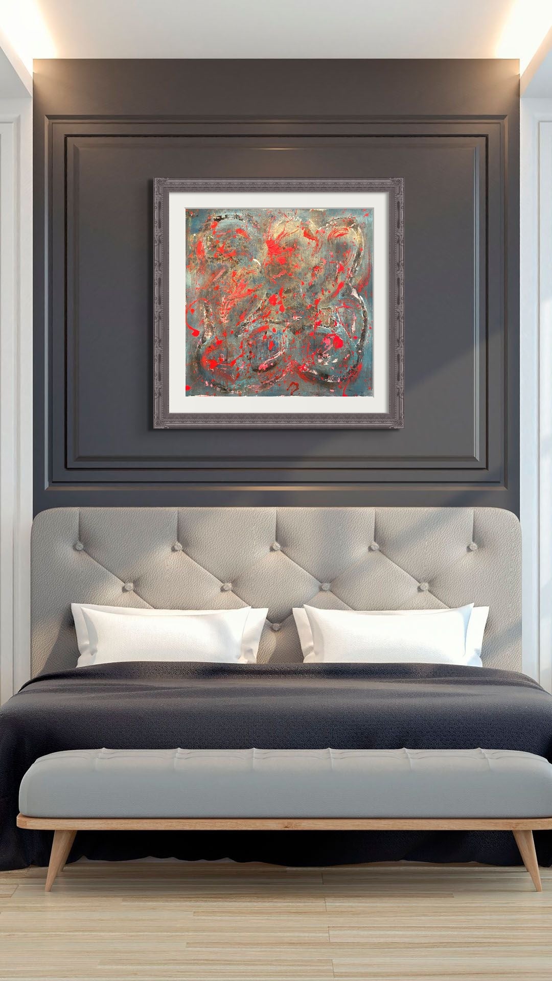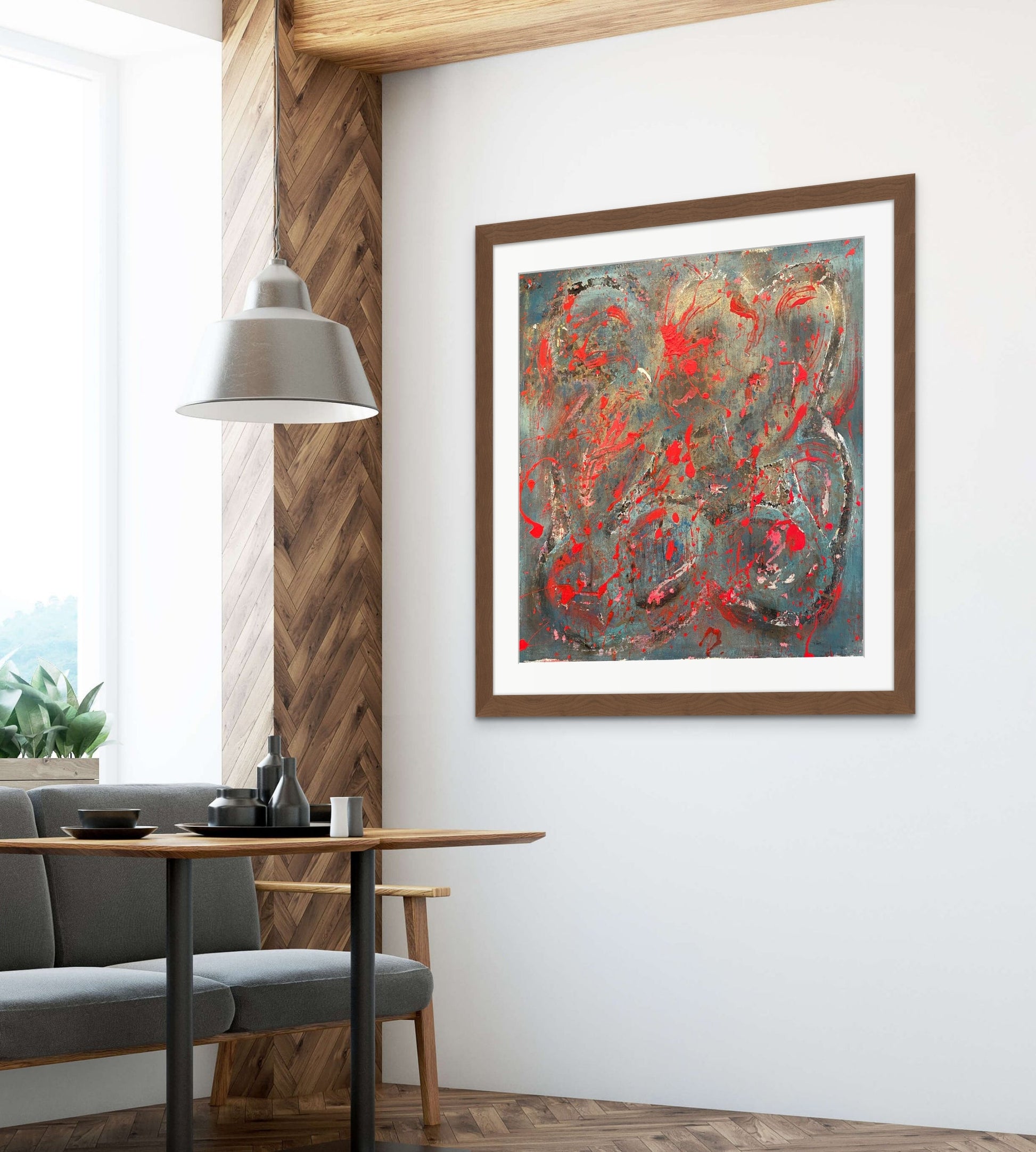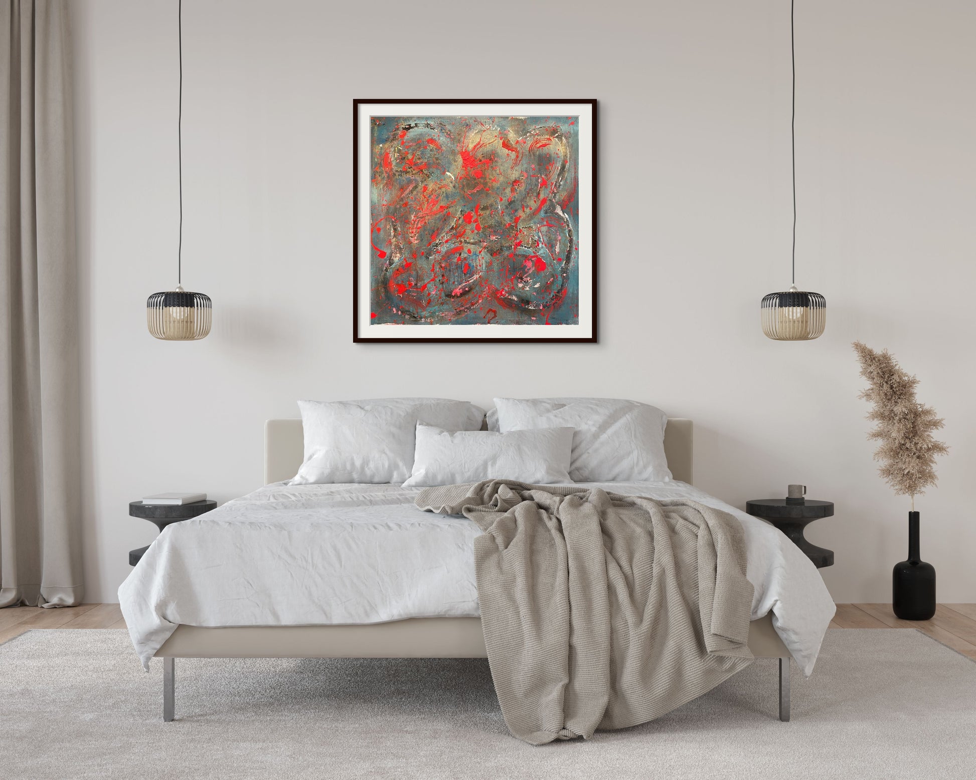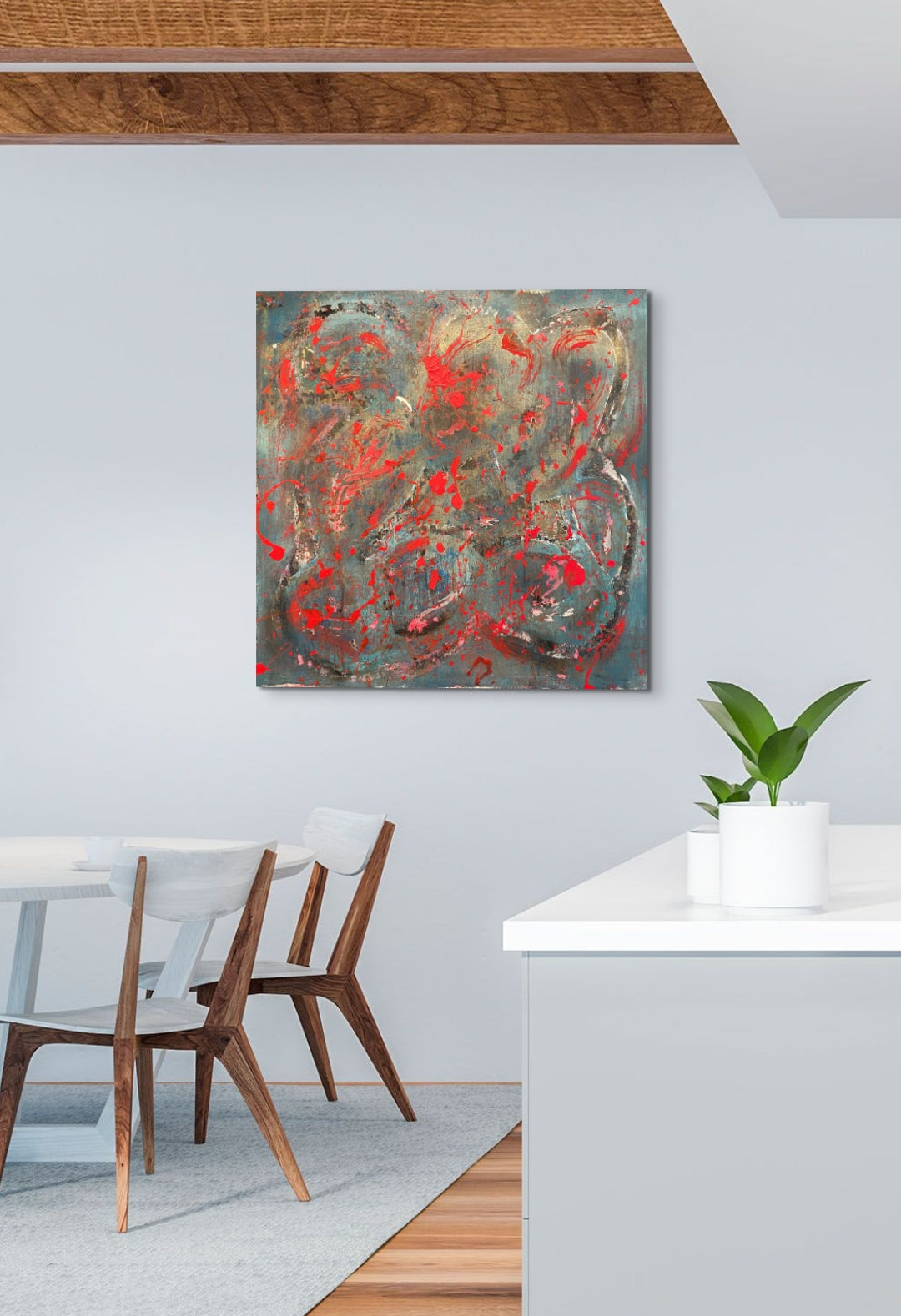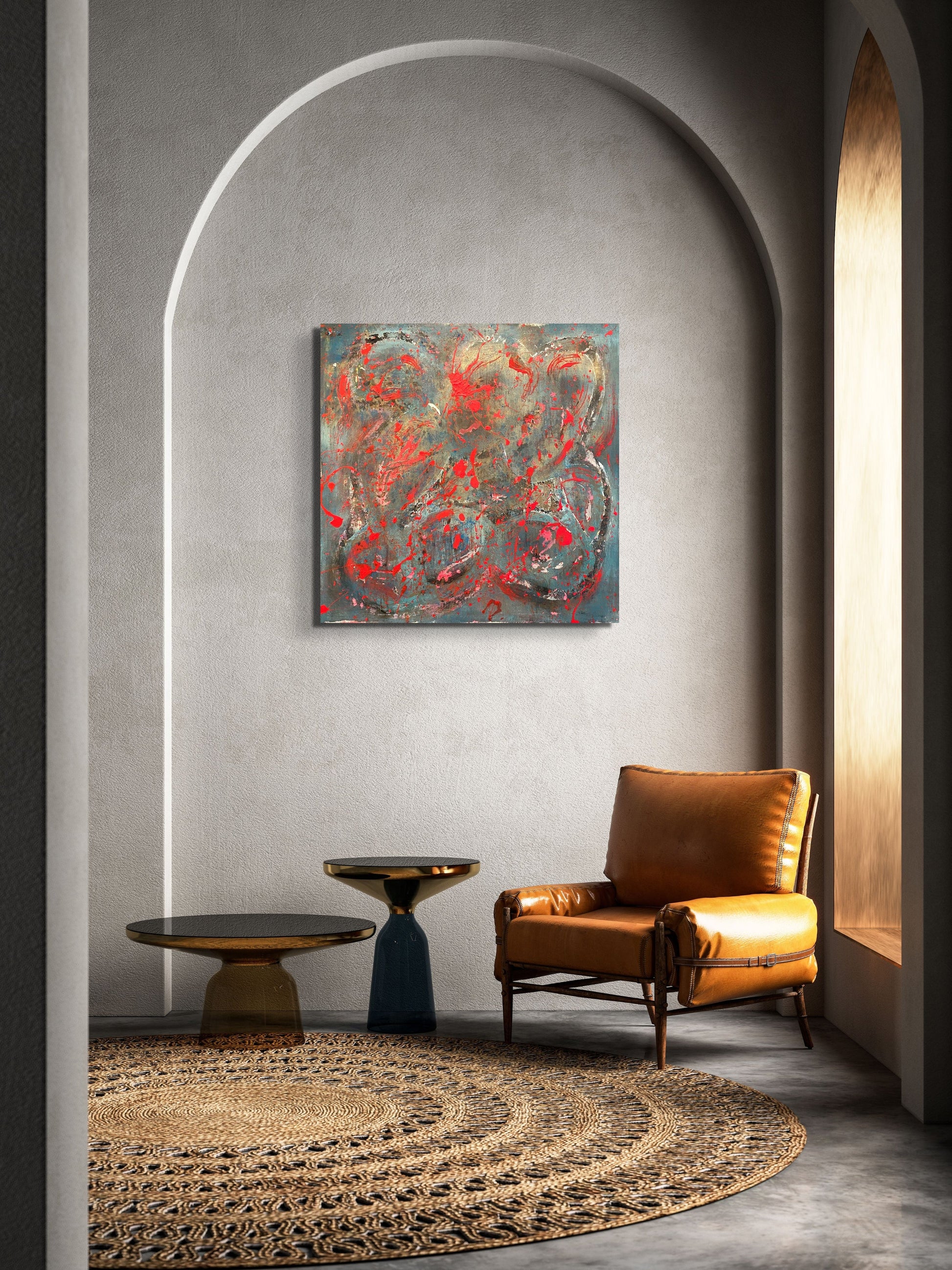 Blood Sweat & Tears is a 36" by 36" piece made by Jason Hatchell, created with spray paint, acrylic and spackle on canvas. Frame is not included.