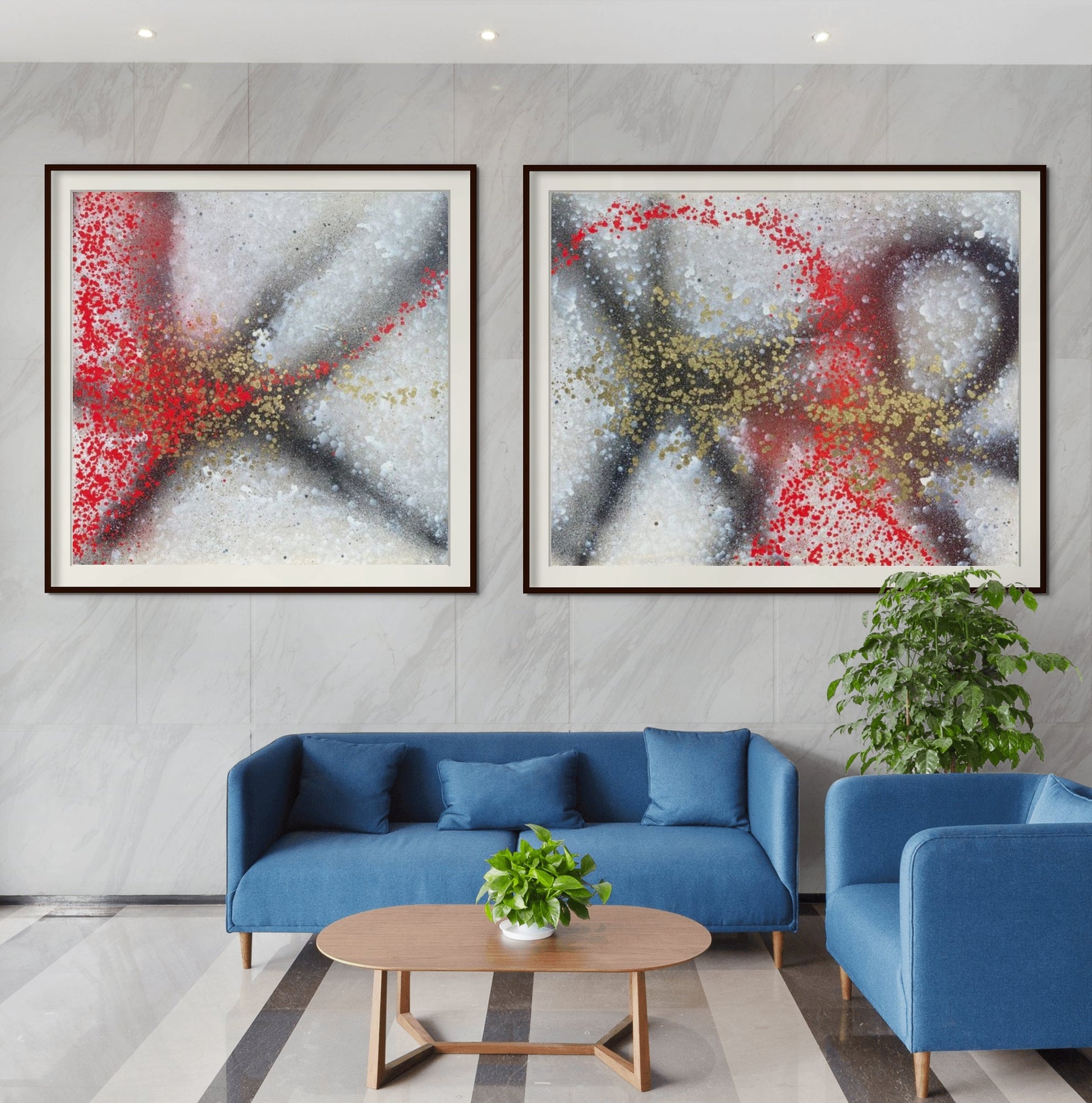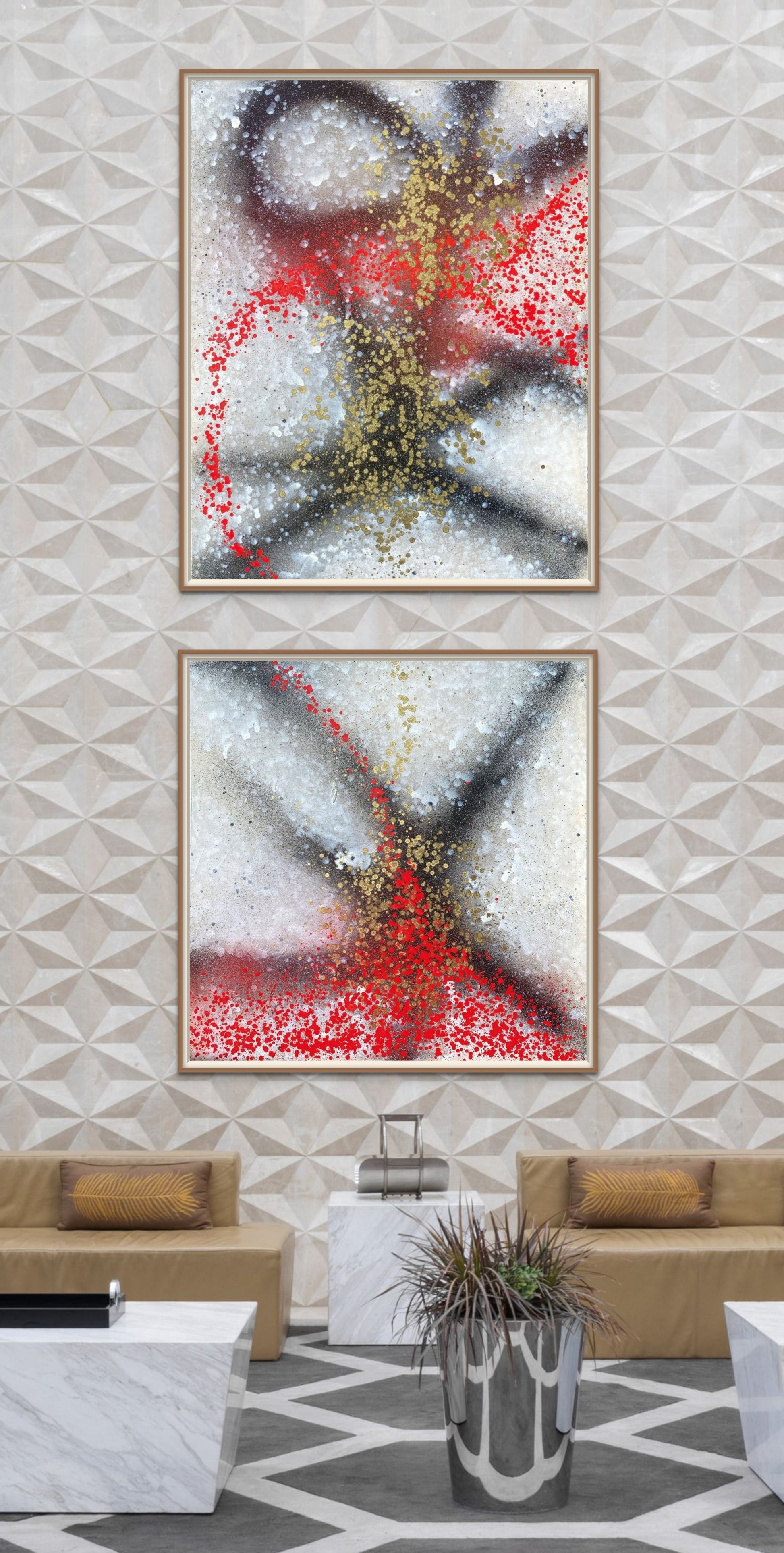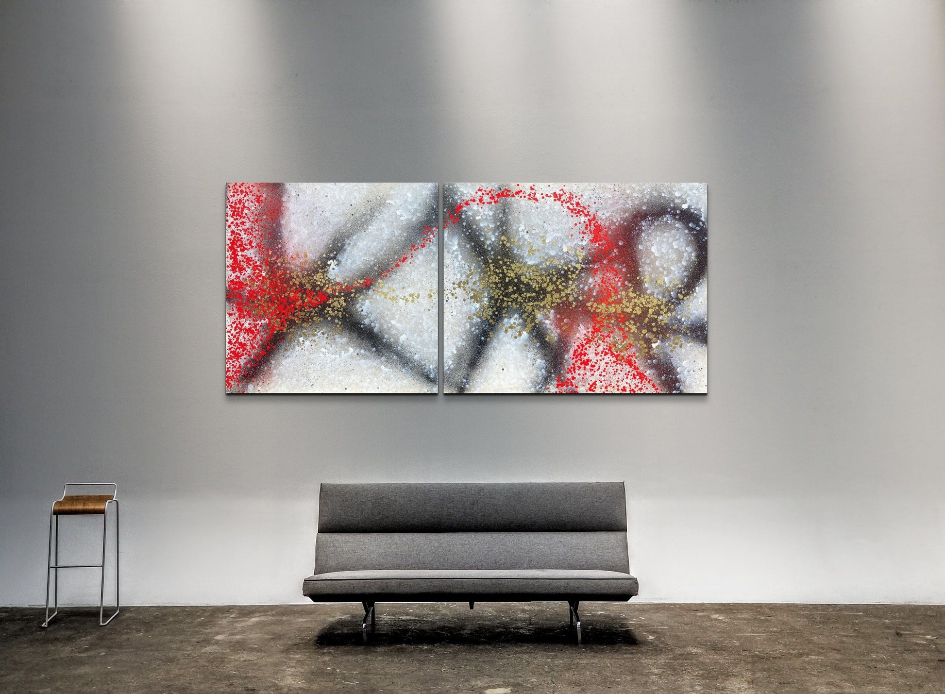 Allele Help From My Friends is a work containing two pieces; one is 48" by 48" and the other is 48" by 60". This work is made by Jason Hatchell, created with spray paint and acrylic on canvas. Frame is not included.